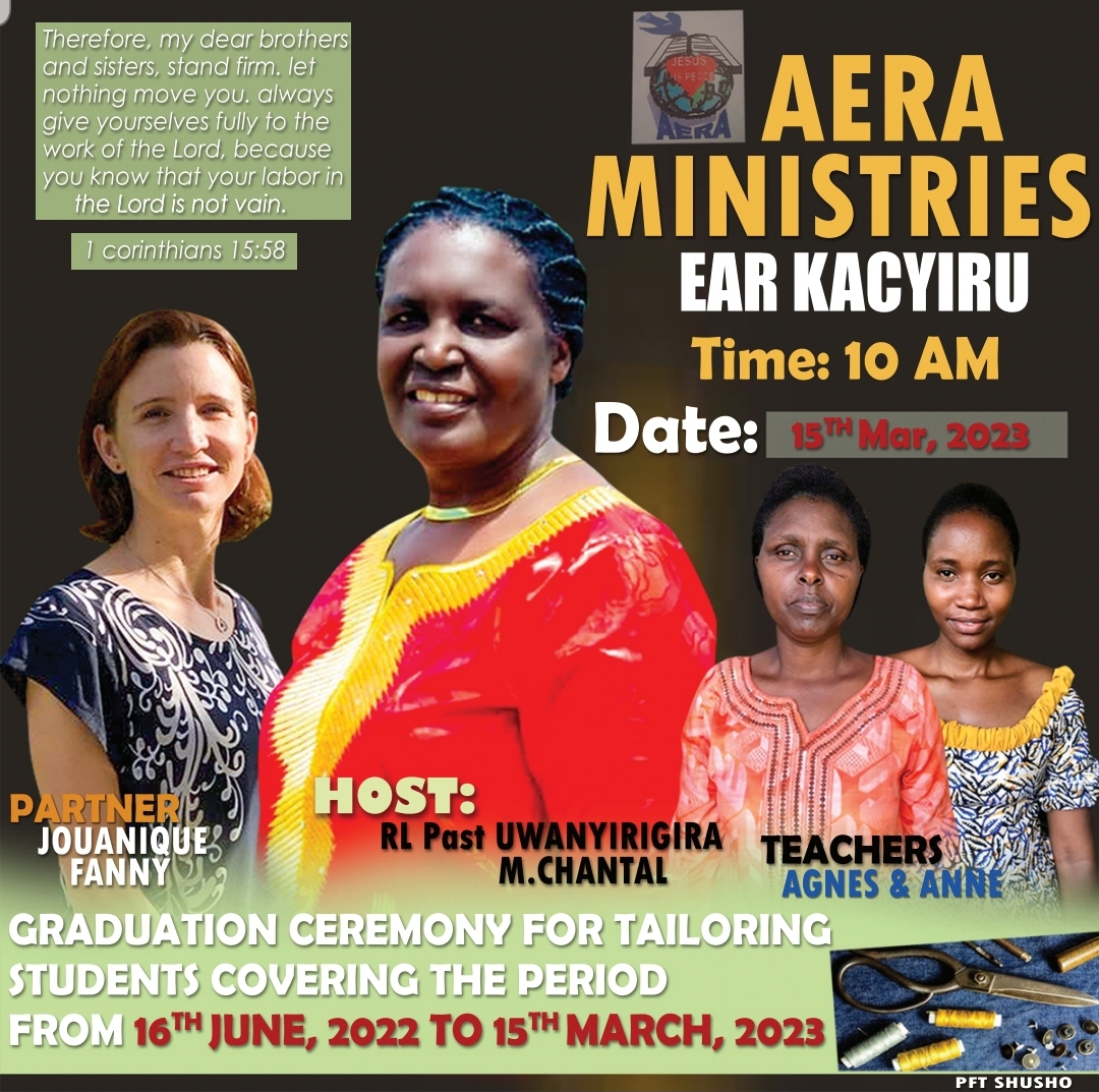 Kuri ubu AERA Ministres igiye gutanga impamyabumenyi (Certificat) ku banyeshuri bigishijwe umwuga wo kudoda mu gihe cy’amezi icyenda. Ni igikorwa kizaba kuwa Gatatu tariki 15 Werurwe 2023 kuri EAR Kacyiru nk’uko Pastor Chantal yabitangarije Paradise.rw.