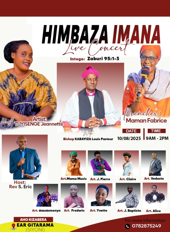 Ku Cyumweru tariki ya 10 Kanama 2025, mu Karere ka Muhanga hazabera igitaramo gikomeye cyiswe “Himbaza Imana Live Concert,” kizahuza abakunzi b’indirimbo zo kuramya no guhimbaza Imana n’abahanzi n’abakozi b’Imana batandukanye bazaririmba, bazigisha, ndetse bakanasengera imbaga.