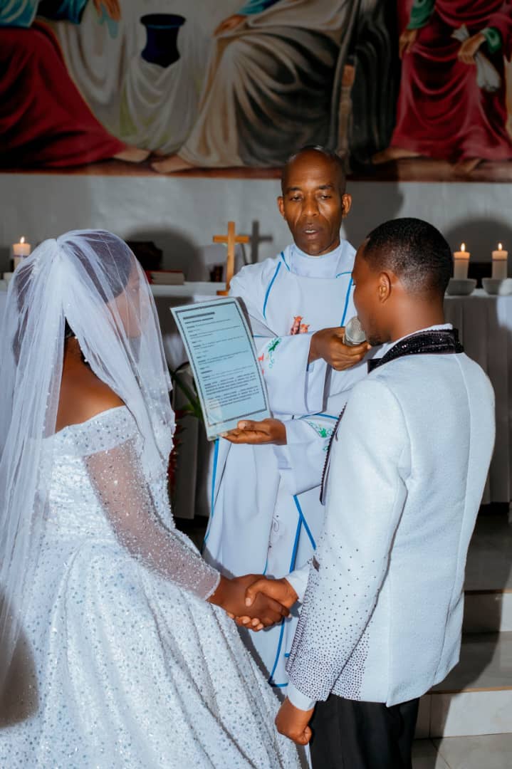 Padiri Nsabimana Jérémie yabasezeranyije, abasabira umugisha w’Imana, anashimangira isezerano ryabo ryo kubana imbere y’Imana, bambikana impeta nk’ikimenyetso cy’urukundo n’ubudaheranwa.