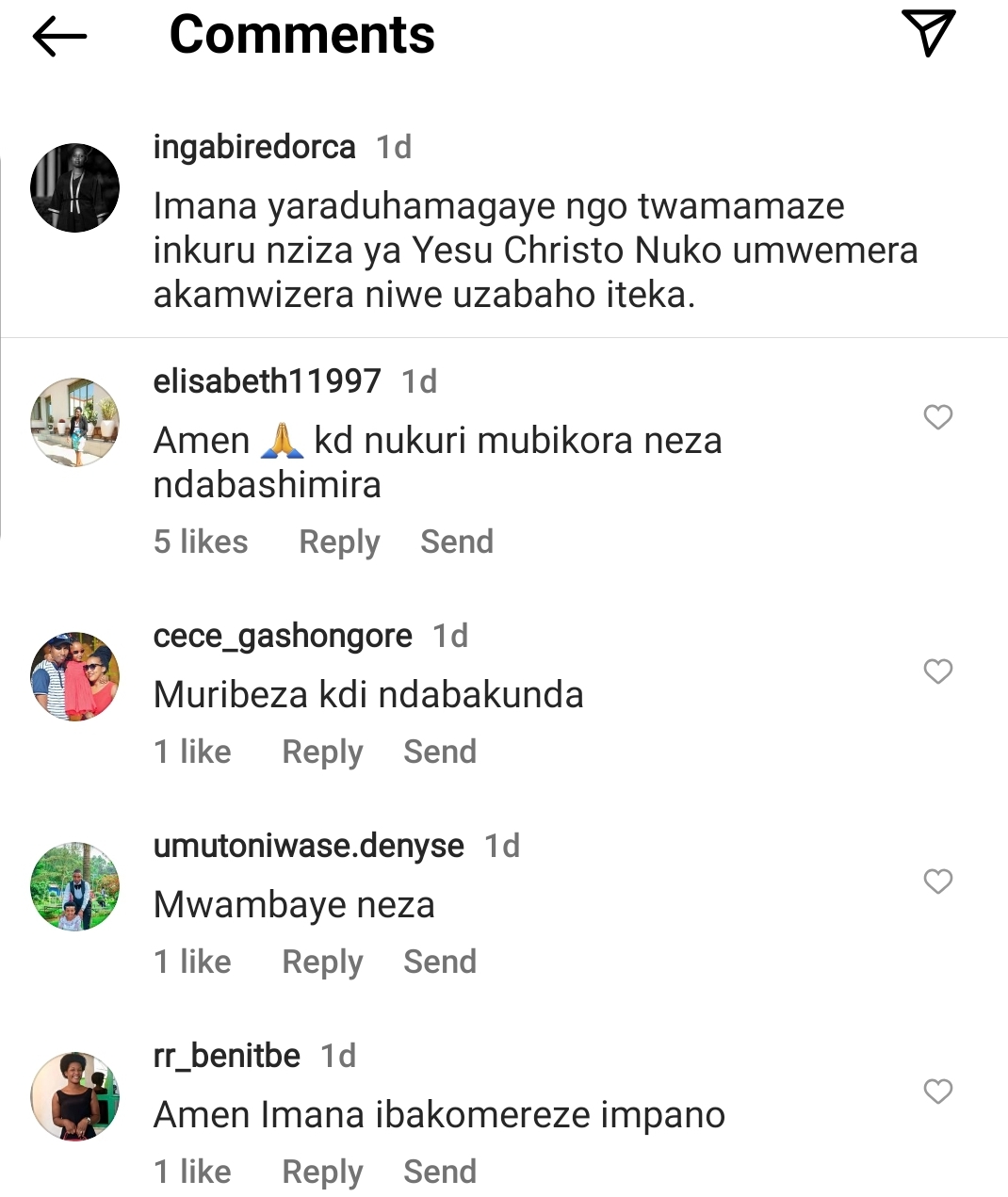 Ni ubutumwa yashyize munsi y’ifoto ari kumwe n’umugabo we, baberewe cyane mu myenda ya Made in Rwanda. Yanditse ati "Imana yaraduhamagaye ngo twamamaze inkuru nziza ya Yesu Kristo, nuko umwemera akamwizera niwe uzabaho iteka". Ubu butumwa bwishimiwe n’abarenga ibihumbi 3 na magana abiri, bukaba bumaze gutangwaho ibitekerezo 36.