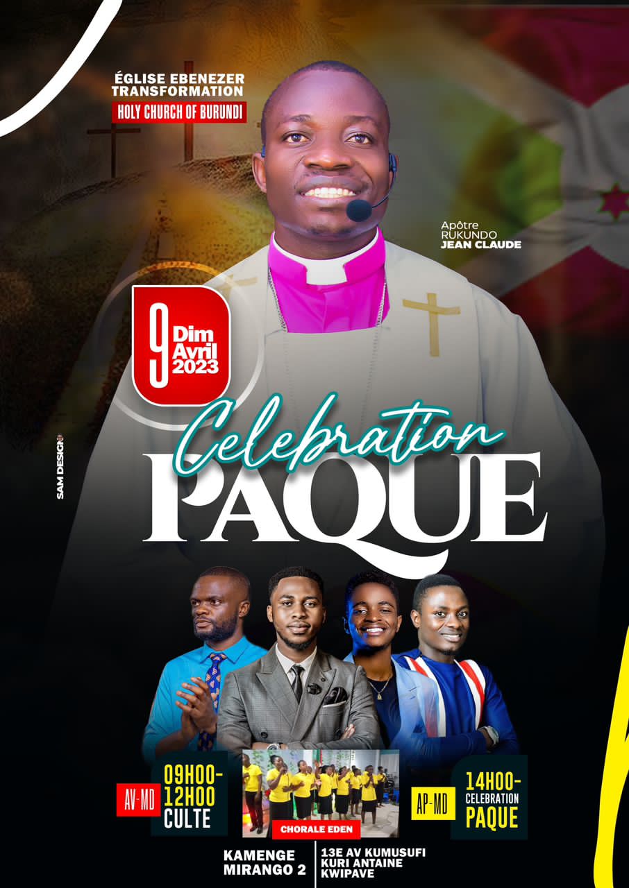 Umwungere Mukuru w’ishengero rya Ebenezer Transformation Holy Church of Burundi, Apôtre RUKUNDO Claude, aratumira abantu bose kuzoba mu gikorane c’umusi umwe wa Pasika aho azoba ari umusi udasanzwe ku buzima bw’umukristo wese uyo musi aho bazoba bibuka umusi w’urupfu no kuzuka kw’umwami Yesu Kristo.
