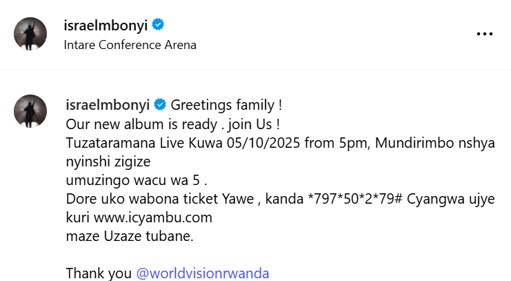 Israel Mbonyi yijeje abakunzi be igitaramo kidasanzwe kirimo ibyishimo n’umwuka w’Imana. Yabasabye kuzitabira ari benshi kugira ngo bazasangire iyi ntambwe nshya mu rugendo rwe rwa muzika.
