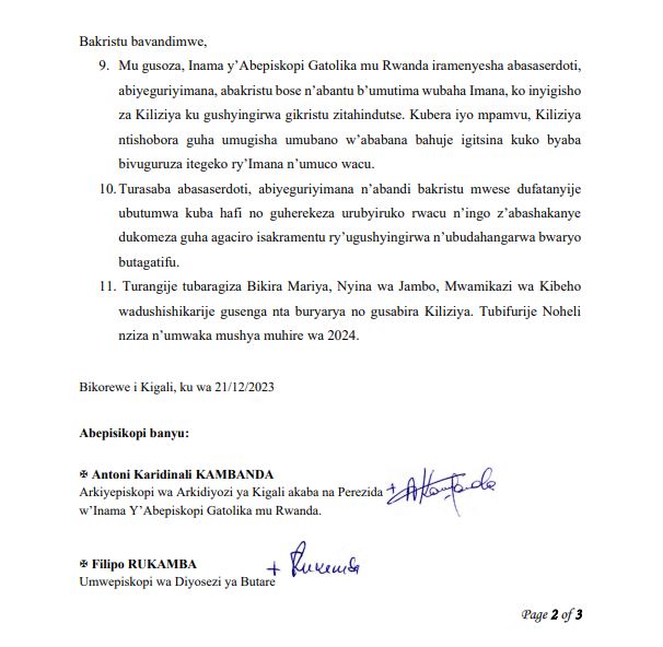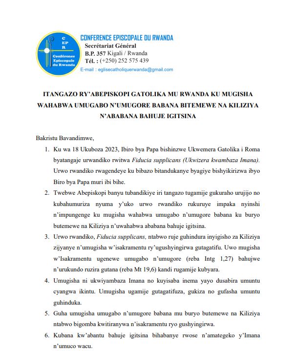Iri ni itangazo ryahawe abapadiri, abiyeguriye Imana n’Abakristo bose muri iki Cyumweru gitangira ku itariki 18 kugera ku itariki 24 Ukuboza, ko badakwiriye kumva ko Kiliziya Gatorika yo mu Rwanda izigera ihindura inyigisho za Kiliziya zo guha umugisha umugabo n’umugore bagiye gushyingiranwa gikristu, ngo ibivange no guha umugisha ababana bahuje ibitsina.