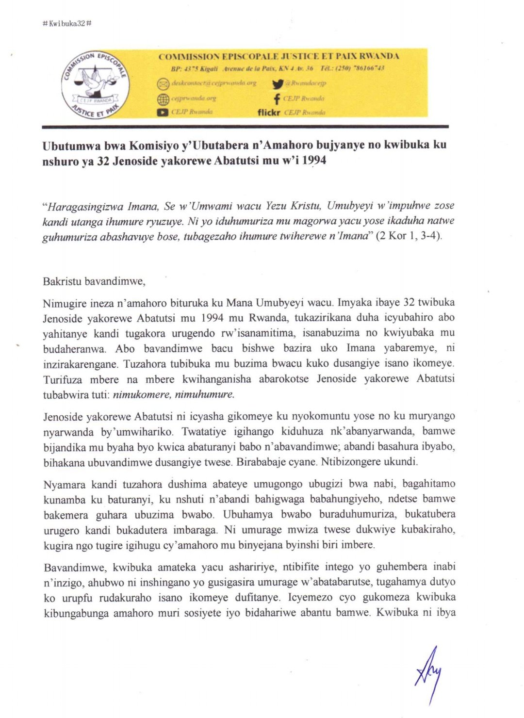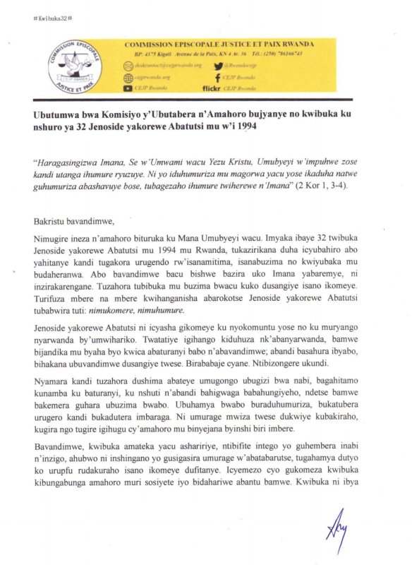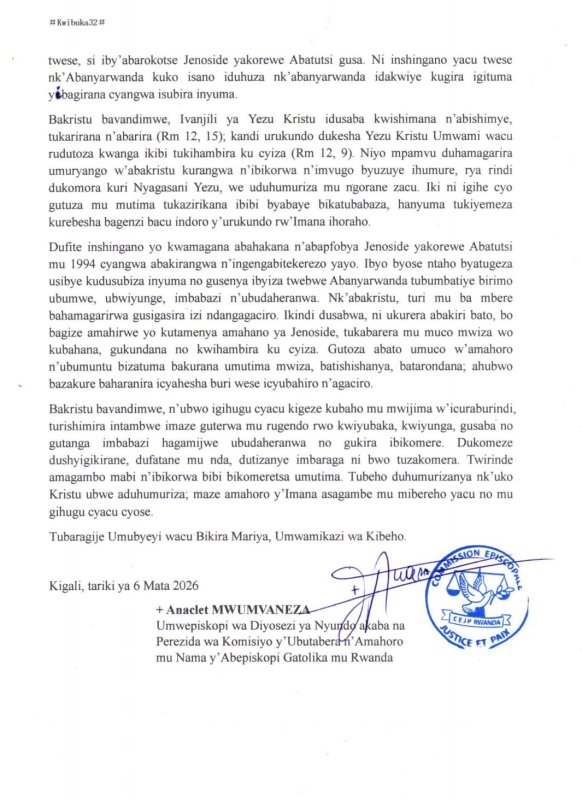 Kinyamateka, nk’ijwi ry’Inama y’Abepiskopi Gatolika mu Rwanda, yatangaje ubutumwa bw’ihumure, kwibuka n’ubwiyunge ku Banyarwanda bose, cyane cyane muri iki gihe cyo kwibuka ku nshuro ya 32 Jenoside yakorewe Abatutsi mu 1994.