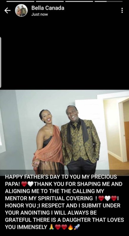 One of spiritual daughter of Dr Bishop Rugagi Innocent of Redeemed Gospel church Rwanda, Prophetess Bella Kabirigi, wished Bishop Rugagi Innocent "Happy Father’s Day" and showed that she respect and acknowledge the role, the Bishop played in the outcome of Bella we see today.