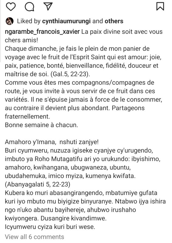 Mu butumwa yanyujije ku mbuga nkoranyambaga ze mu minsi ishize, Mwalimu w’Urukundo ari we Muzehe Xavier, yagize ati "Amahoro y’Imana, nshuti zanjye! Buri cyumweru, nuzuza igiseke cyanjye cy’urugendo, imbuto ya Roho Mutagatifu ari yo Urukundo, Ibyishimo, Amahoro, Kwihangana, Ubugwaneza, Ubuntu, Ubudahemuka, Imico myiza, Kumenya kwifata. (Abanyagalati 5, 22-23).