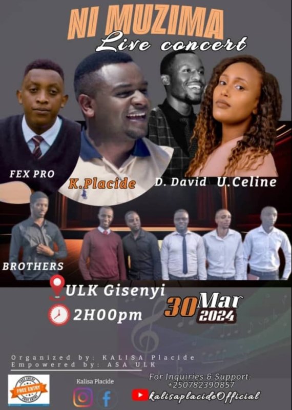 Umuhanzi mu ndirimbo zo kuramya no guhimbaza Imana Kalisa Placide usengera mu itorero ry’Abadivantisite b’Umunsi wa Karindwi (SDA), agiye gukorera igitaramo yise Ni Muzima Live Concert mu Mugi wa Gisenyi uherereye mu Karere ka Rubavu, mu kigo cya Kaminuza y’Abadivantisite ya ULK Gisenyi.