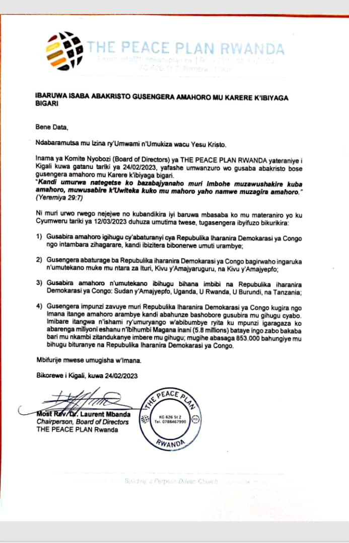 Itangazo ryateweho umukono n’Umuyobozi Mukuru wa PEACE PLAN, Most. Rev. Dr Laurent, usanzwe ari na ArchBishop w’Itorero Angilikani ry’u Rwanda, rihamagarira abakristo bose gusengera amahoro mu Karere ka Afrika y’Uburasirazuba.