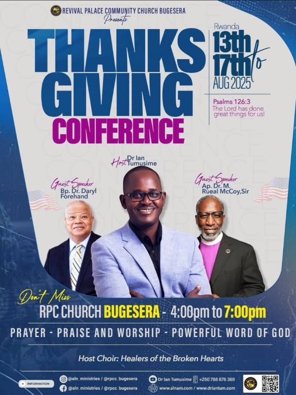 Thanksgiving Conference 2025 si igiterane gisanzwe; ni ubukwe bwo mu mwuka, ni ibihe by’ububyutse, ni igihe cyo kuruhuka mu buzima bw’umwuka no kwakira impinduka zituruka ku Mana. Abategura iki giterane barahamagarira buri wese kuza kwifatanya na bo — yaba atuye Bugesera, Kigali, cyangwa mu bice bitandukanye by’igihugu n’inshuti z’itorero zo hanze y’u Rwanda.