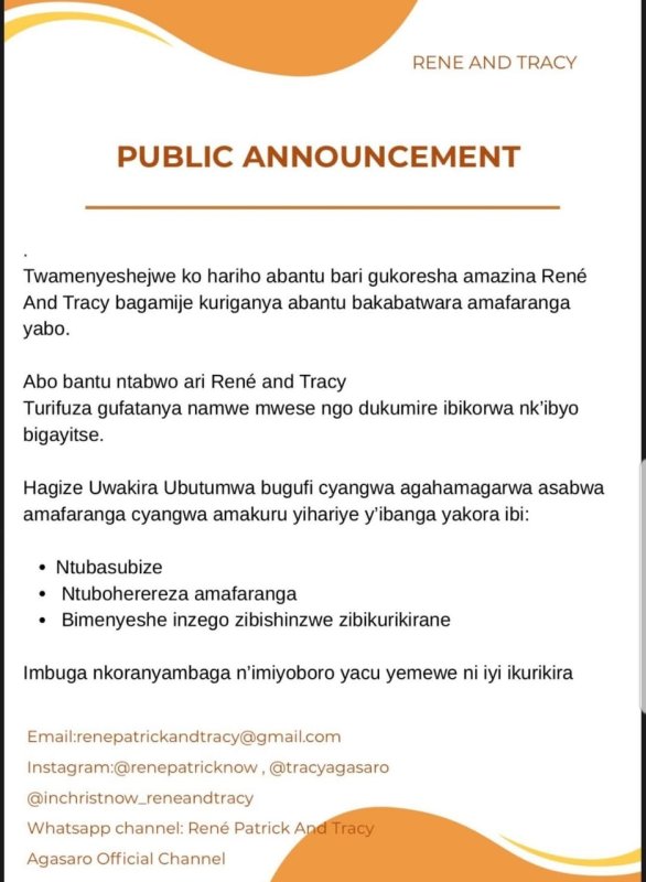Muri iryo tangazo, René na Tracy batangaje ko hari abantu bakomeje kwitwaza amazina yabo bakishora mu bikorwa byo gusaba cyangwa kwakira amafaranga babiyitirira, ibintu bavuga ko batigeze batangira uburenganzira kandi ko batabifitemo uruhare na ruto.