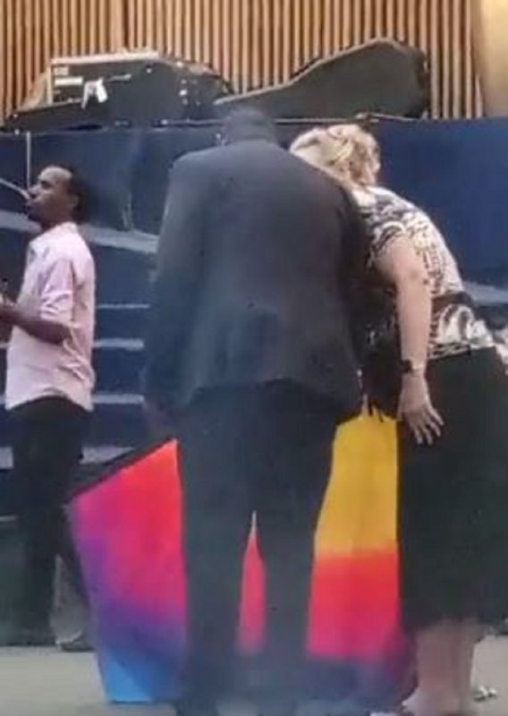 Nyuma y’amasegonda make abikora, amashusho yerekana Umushumba Mukuru w’Itorero rya ADEPR mu Rwanda, Ndayizeye Isaie, yegera uwo mugore ndetse amubuza gukomeza kuzamura icyo gitambaro.