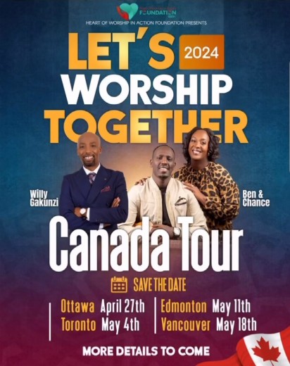 Willy Gakunzi, who is an Author, Evangelist and Gospel artist, is organizing this concert titled ’Let’s Worship Together With Ben & Chance’. It will begin on April 27, 2024 in Ottawa, continue to Toronto on May 4, and Edmonton on May 11, and closed on May 18 in Vancouver.