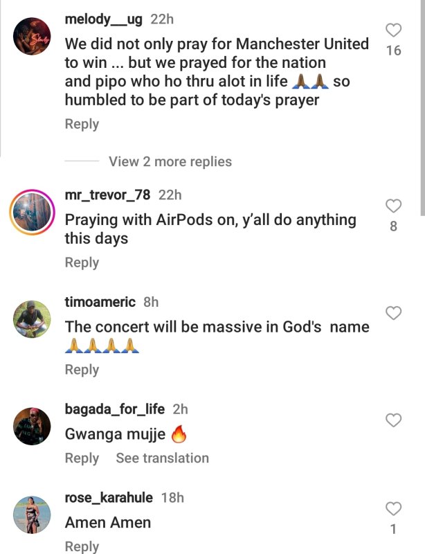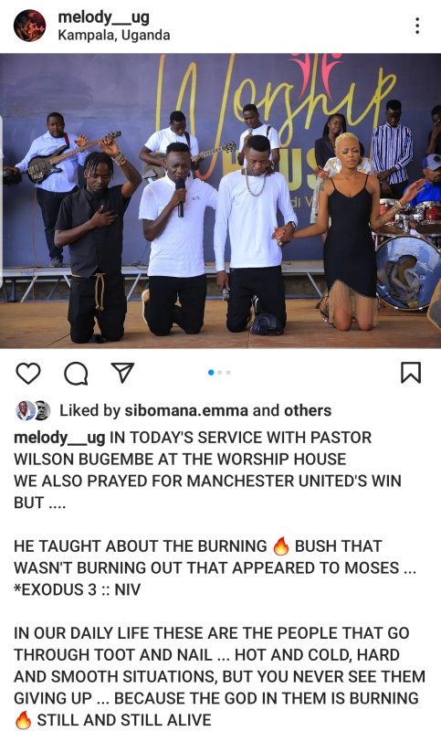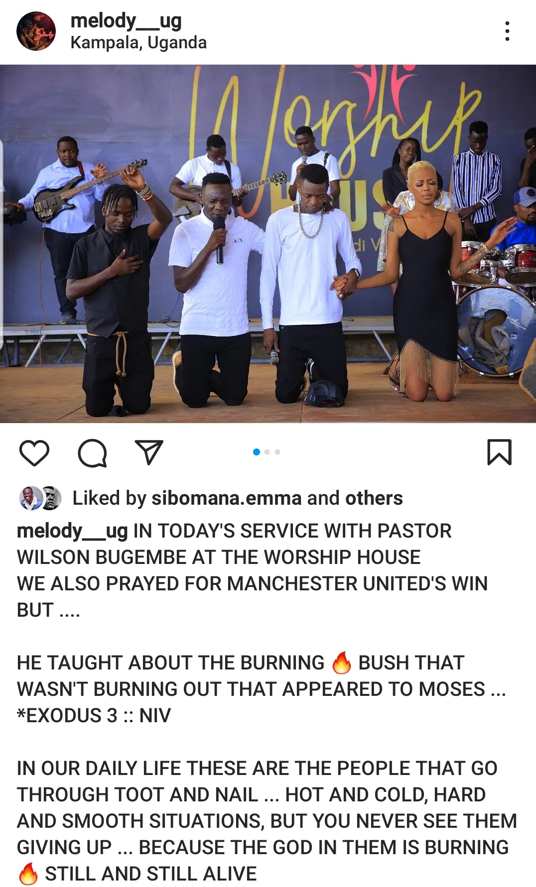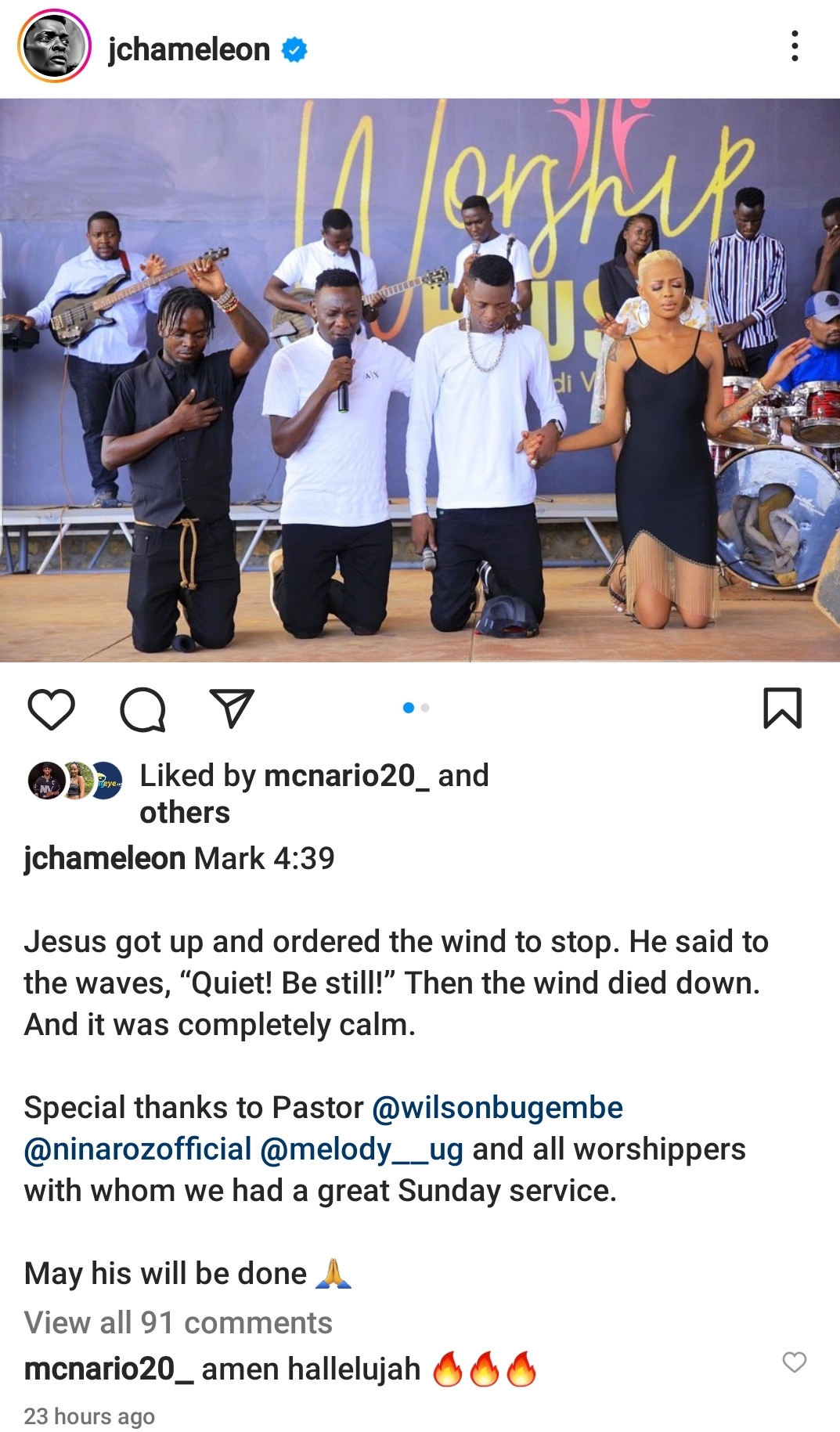 Imbere y’abakristo bari bitabiriye aya materaniro, Pastor Bugembe yasengeye Chameleone anashyira imbere y’Imana igitaramo yitegura gukora kugira ngo umunsi wacyo "uzabe umunsi mwiza". Melody UG yanditse kuri Instagram ko mu byo basengeye harimo n’umukino wa Manchester United. Chameleone yashimiye cyane Bugembe wamwakiriye bagasengana.