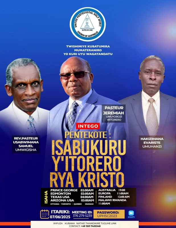 Itorero rya United Pentecost Holy Spirit Church of Australia, mu rwego rwo kwizihiza umunsi mukuru wa Pentecote, ryatumiye Rev. Pastor Usabwimana Samuel n’umuhanzi Hakizimana Evaliste mu materaniro azabera kw’ikoranabuhanga hifashishijwe uburyo bwa Zoom Meeting, akazayoborwa na Pastor Jeremiah, umushumba mukuru w’iri torero.