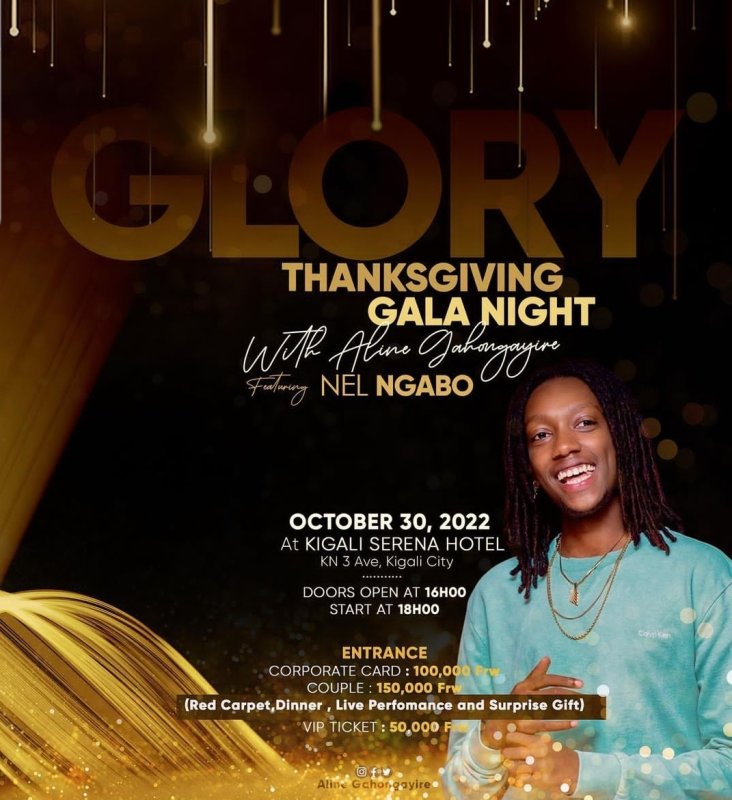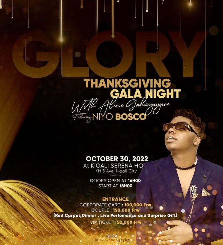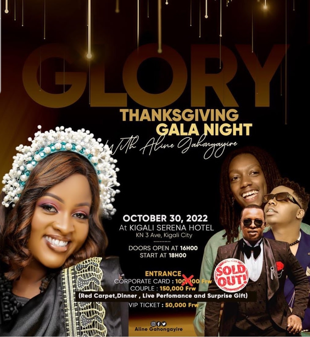 Twakwibutsa ko igitaramo cya Aline Gahongayire kizaba ku Cyumweru tariki 30 Ukwakira 2022 kikabera muri Kigali Serena Hotel kuva saa Kumi z’umugoroba. Kwinjira ni ibihumbi 100 Frw mu myanya y’icyubahiro cyinshi, ibihumbi 150 Frw kuri Couple ndetse n’ibihumbi 50 muri VIP.