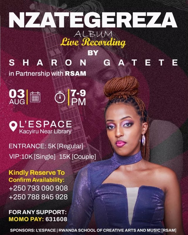 Iki gitaramo kizaba ku bufatanye na Rwanda School of Creative Arts and Music (RSAM), kizabera ku Kacyiru ahitwa L’Espace hafi ya Rwanda Library. Sharon arasaba abanyarwanda, abakunzi b’indirimbo zo kuramya no guhimbaza Imana n’itangazamakuru by’umwihariko kuzaza kumushyigikira.