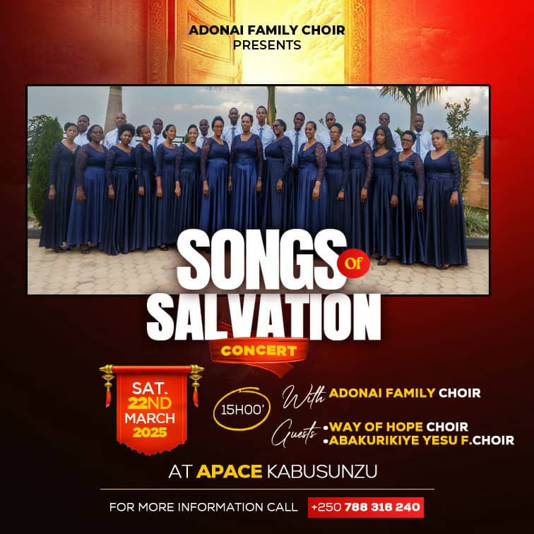 Ni igitaramo giteganyijwe ku Isabato yo kuwa 22 Werurwe 2025 kikazabera mu kigo cy’amashuli cya APACE Kabusunzu. Adonai Family Choir ni korali y’ubukombe ibarizwa mu itorero ry’abadiventiste bumunsi wa karindwi ryo mukigo kishuri cya APACE.