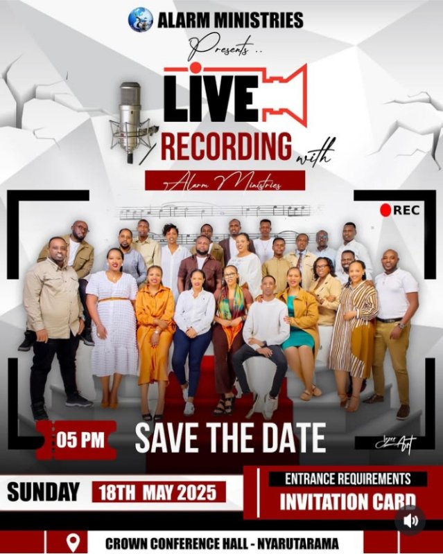 Alarm Ministries yamamaye cyane mu ndirimbo zirimo Intsinzi, Mbega Imana, n’izindi zagiye zigaragaza ubutumwa bukomeye, zigatanga umutuzo w’umutima ndetse n’ihumure ryo mu gakiza. Iyi Live Recording itegerejwe na benshi kuko izaba ari amahirwe yo kumva no kureba amashusho mashya y’indirimbo zifite ubutumwa bwubaka, ziri mu mwuka n’ubuhanga.