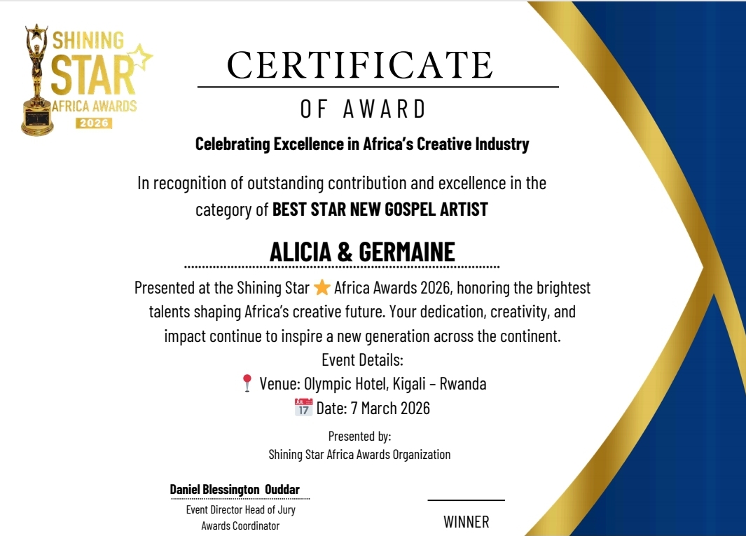 Abakobwa bavukana bakunzwe mu muziki wa Gospel mu Rwanda, Alicia & Germaine, begukanye igihembo cya Best Star New Gospel Artist [umuhanzi mushya mwiza wa Gospel muri Africa] mu bihembo bya Shining Star Africa Awards bya 2026, bishimira intambwe bagezeho mu muziki wo kuramya no guhimbaza Imana.