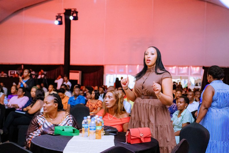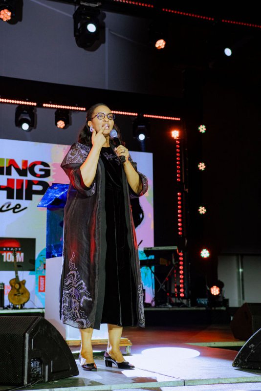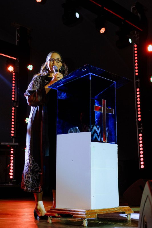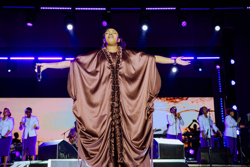 Akaruru kenshi cyane! Mu ikanzu nziza ya chocolate, ahagana saa 06h55 Jesca Mucyowera wari wambaye ikanzu nziza cyane y’ibara rya chocolate yageze ku ruhimbi. Mbere yo kuririmba yiragije Umurenyi azamura isengesho ry’imbaraga.