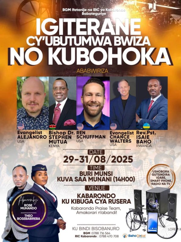 Iliandaliwa na Baho Global Mission (BGM) kwa kushirikiana na Rwanda Inter-Religious Council (RIC) Kabarondo. Tukio hili limeandaliwa kwa ajili ya watu wote wanaotaka kusikiliza neno la Mungu, kuomba, kupokea wokovu na kuona mabadiliko chanya katika maisha yao ya kila siku.