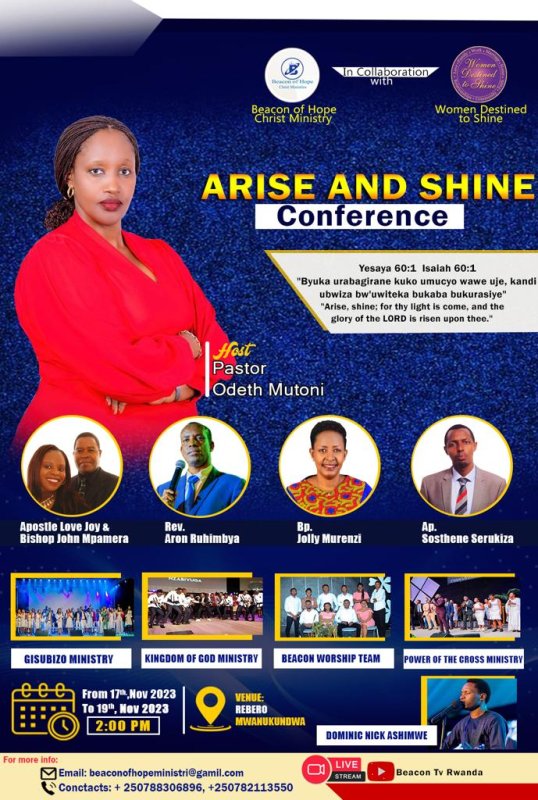 "Arise and Shine Conference" ni igiterane cy’iminsi itatu cyatumiwemo umuramyi Dominic Ashimwe n’amatsinda y’abaririmbyi atandukanye nka Gisubizo Ministry, Kingdom of God Ministry, Beacon Worship Team na Power of the Cross Ministry.