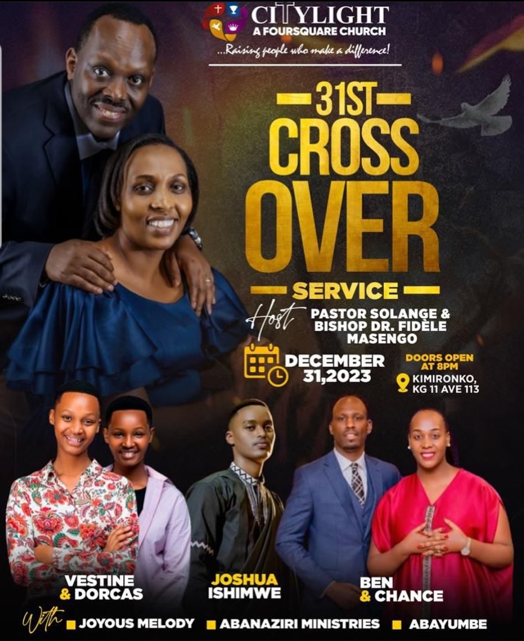 Kuri iki cyumweru Ku wa 31 Ukuboza 2023 ku itariki isoza umwaka itorero rya City Light A Foursquare church harabera amateraniro yo gukesha azabinjiza mu mwaka mushya wa 2024 hamwe na Bishop Dr. Fidele Masengo na Pastor Solange Masengo.