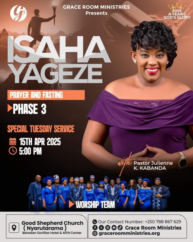 Grace Room Ministries yateguye igiterane cyihariye cyo gusenga no kwiyiriza ubusa cyiswe ISHAHA YAGEZE, Phase 3, kiraba kuri uyu wa Kabiri tariki 15 Mata 2025, guhera saa Kumi n’Imwe z’umugoroba (5:00 PM), muri Good Shepherd Church i Nyarutarama, hagati ya Gorillas Hotel na MTN Center.