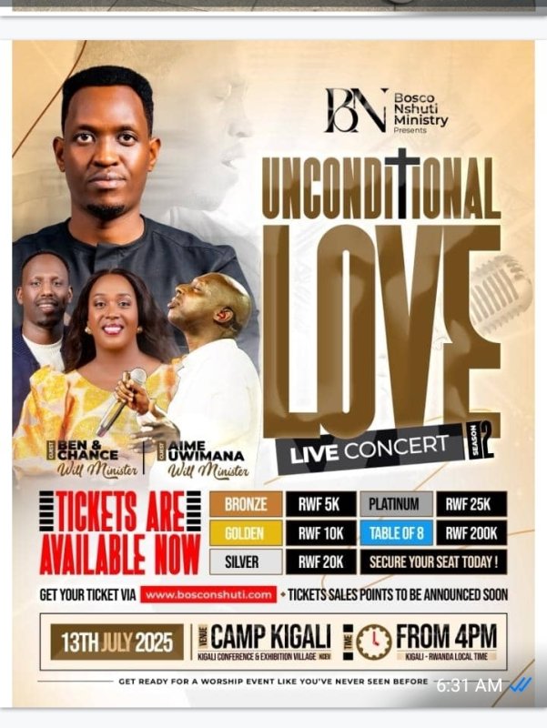 Amatike yo kwinjira muri unconditional love live concert yamaze kugera hanze, akaba ari kuboneka ku rubuga rwe www.bosconshuti.com. Itike yo mu bwoko bwa Bronze iragura 5,000 Frw, iyo mu bwoko bwa Golden iragura 10,000 Frw, iyo mu bwoko bwa Silver ireagura 20,000 Frw, naho Platinum iragura 25,000 Frw. Ni mu gihe ameza [Table] y’abantu 8 igura 200,000 Frw.