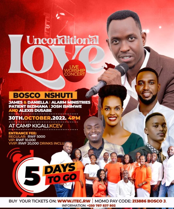 Twabibutsa ko igitaramo cya Bosco Nshuti kizaba tariki 30 Ukwakira 2022, kibere muri Camp Kigali kuva saa kumi zuzuye z’umugoroba. "Tuzavugamo urukundo gusa Imana yadukunze" - Bosco Nshuti abwira Paradise.rw intego y’iki gitaramo cye.