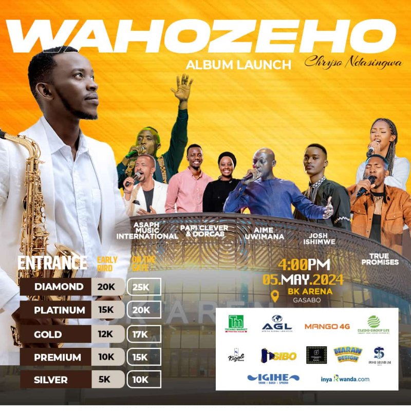 Gura itike ya 5k; 10k; 12k; 15k na 20k kugira ngo wizere neza ko uzataramana Josh Ishimwe, Papi Claver na Dorcas, Aime Uwimana, Azaph Music International, Himbaza Club na True Promises kuko ari bo bazafasha Chryso Ndasingwa muri “Wahozeho Album Launch”.