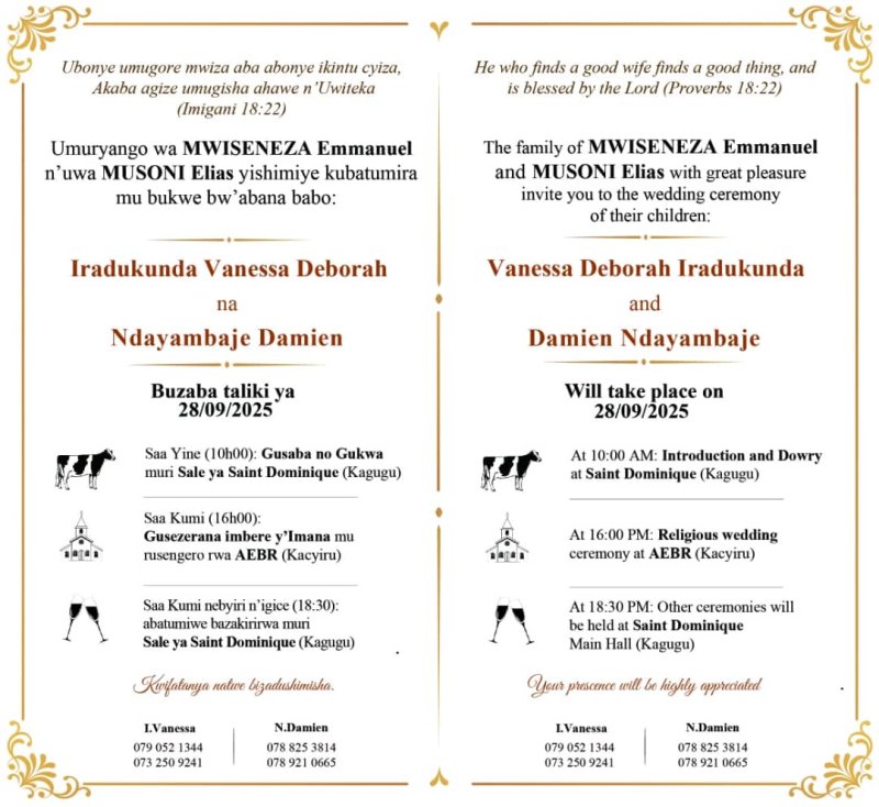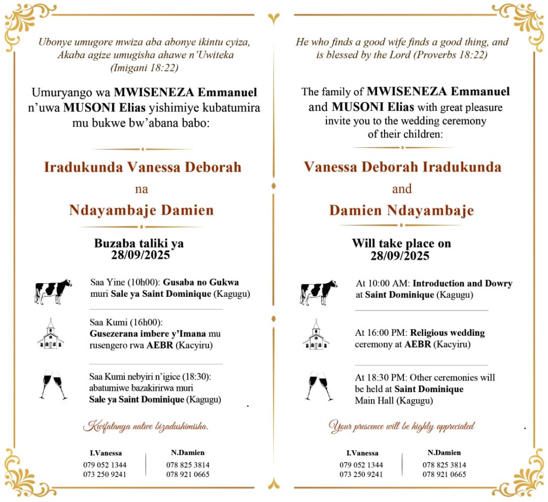 Nukuri mubigaragarira amaso yababibonye nibyiza cyane pee.ibyo twabonye bidukumbuza ibindi birimbere kuwa 28,09,2025 uko byo bizaba bigeze bityo rero umukobwa utereka ababyeyi be nkibi sinatinya kumwita ikigwari kuko nibyishimo biba bitazagaruka undi.murakoze ndabakunda cyane n’lmana irabizi!