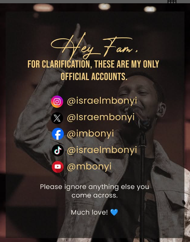 Umuramyi ukunzwe cyane mu Rwanda no mu mahanga, Israel Mbonyi, yatanze ubutumwa bw’ingenzi ku bakunzi be asobanura konti ze zemewe ku mbuga nkoranyambaga.