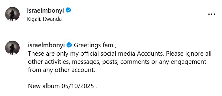 Icyakora, itangazo ry’izi konti ntiryari ryonyine – ryari rinajyanye no gutangaza inkuru y’ingenzi: Album nshya ya Mbonyi izasohoka ku itariki ya 5 Ukwakira 2025. Ibi byashimishije abatari bake, bamwe bagira bati: “Bring it on, Man of God.” (Yiduhe, muntu w’Imama)