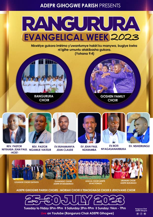 Yatangaje ko bazaba bitabiriye igiterane kinini cyiswe Rangurura week kizamara icyumweru cyose aho korali Gosheni izakora ivugabutumwa mu minsi ibiri ya nyuma, ni ukuvuga le 29-30/07/2023.
