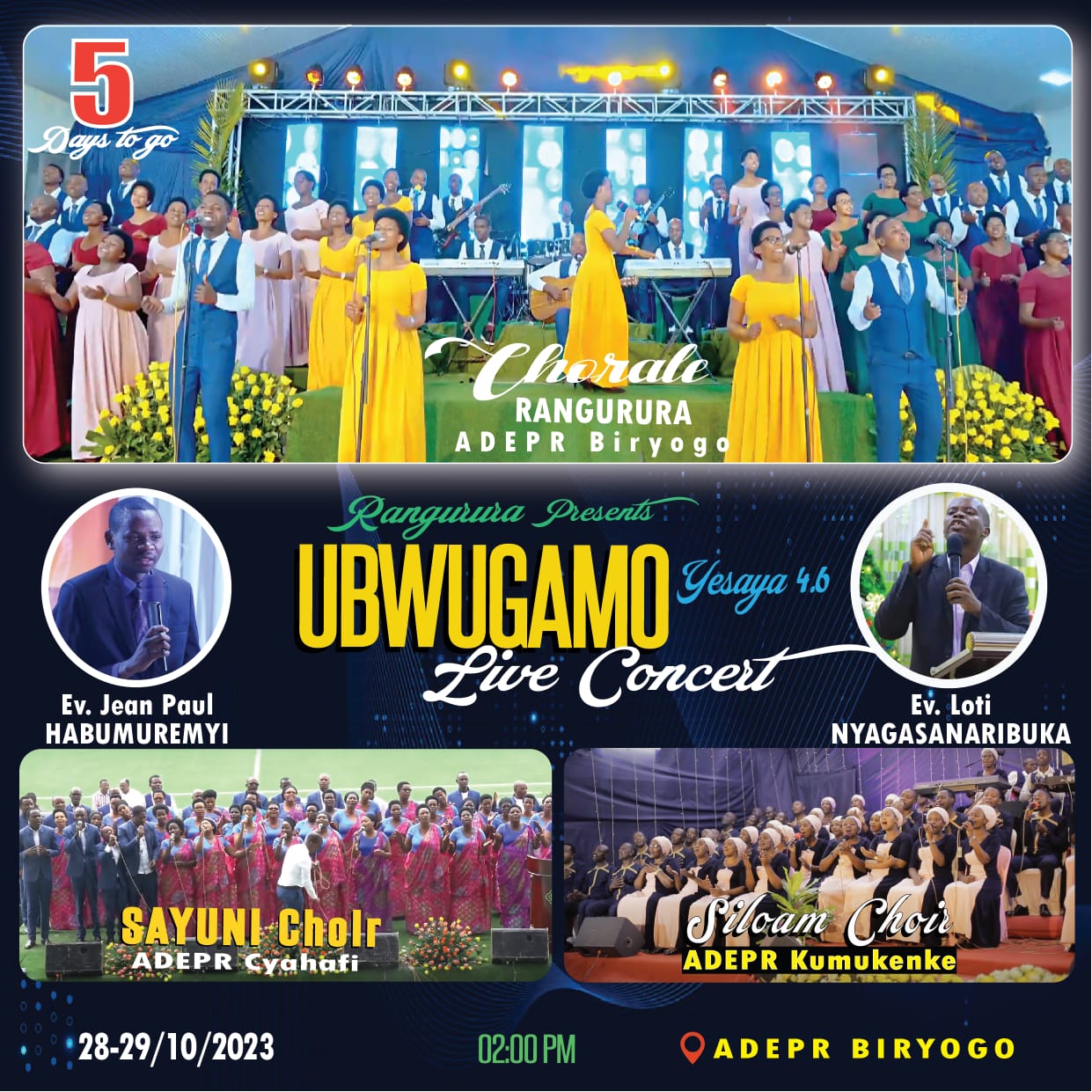Kizabera kuri ADEPR Biryogo guhera ku wa Gatandatu saa munani z’umugoroba hamwe na korali Sayuni n’umuvugabutumwa witwa Ev. Habumuremyi Jean Paul. Ku cyumweru bazakomezanya na Siloam hamwe n’umuvugabutumwa witwa Ev. Nyagasaniribuka Loti.