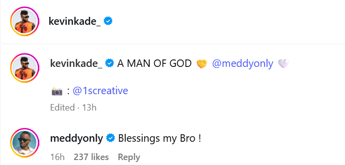 Nyuma yaho ni bwo yifotozanyije na Richard Ngabo ukoresha Kevin Kade mu buhanzi na we wari wagiye gutaramirayo. Kevin Kade yayishyize kuri Instagram ye yandikaho amagambo agira ati: “A man of God” (umuntu w’Imana). Meddy na we ntiyatinze gusubiza mu buryo bworoheje ati: “Blessings my bro” (Imigisha kuri wowe musaza).