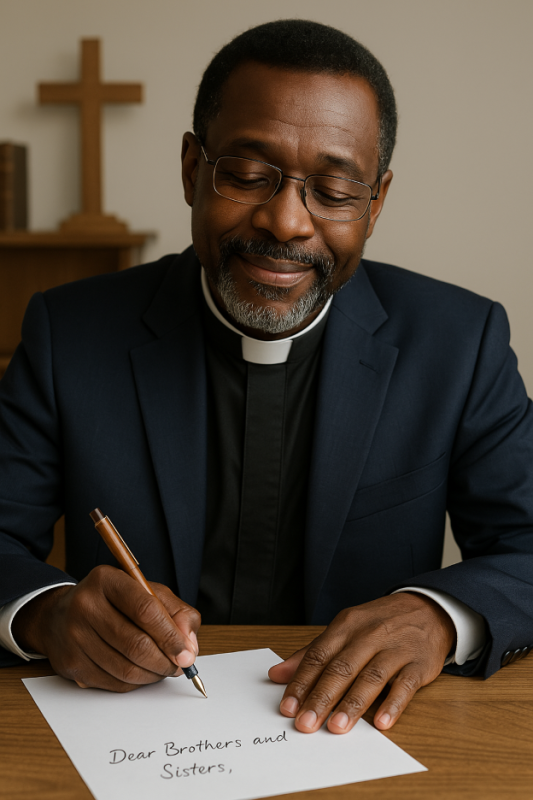 Iyi foto yakozwe na AI (Artificial Intelligence). Igaragaza umushumba uri kwandikira itorero ibikubiye muri iyi nkuru