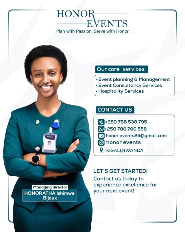 Ukeneye serivisi zitangwa na Honor Events yashinzwe na Bijoux, wabahamagara kuri tekefone igendanwa +250786538795 cyangwa ukabandikira kuri WhatsApp: +250780700558. Ushobora no kubandikira kuri Email yabo: [email protected]. Wanabasanga kuri Instagram aho bitwa @HonorEvents.