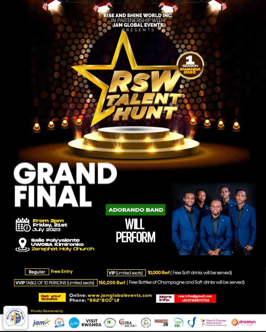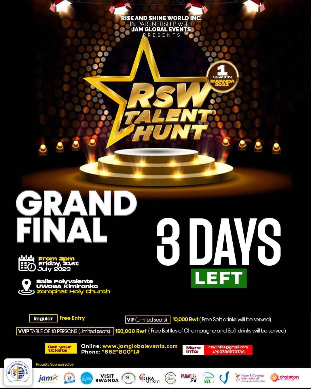 Tubibutse ko irushanwa rya Rise and Shine Talent Hunt (RSW) rizasozwa kuwa 5 tariki 21/07/2023 mu nzu mberabyombi ya UWOBA KIMIRONKO ku rusengero rwa Zerephat Holy Church.