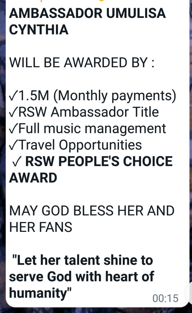 Si igihembo cy’amafaranga gusa Umurisa Cynthia yagenewe kuko Rise and Shine World Ministries itegura iri rushanwa izarebera inyungu ze mu gihe kingana n’umwaka. Cyntia kandi yagizwe Ambasaderi wa 1 muri aba bahanzi ndetse akaba afite amahirwe yo gutemberezwa hirya no hino mu gihugu.