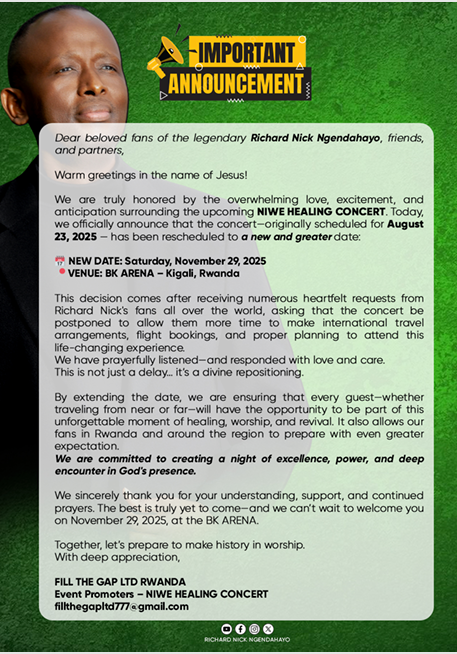 The much-anticipated Ni we Healing Concert, initially scheduled for August 23, 2025, has been rescheduled to Saturday, November 29, 2025, and will take place at BK Arena in Kigali, Rwanda.
