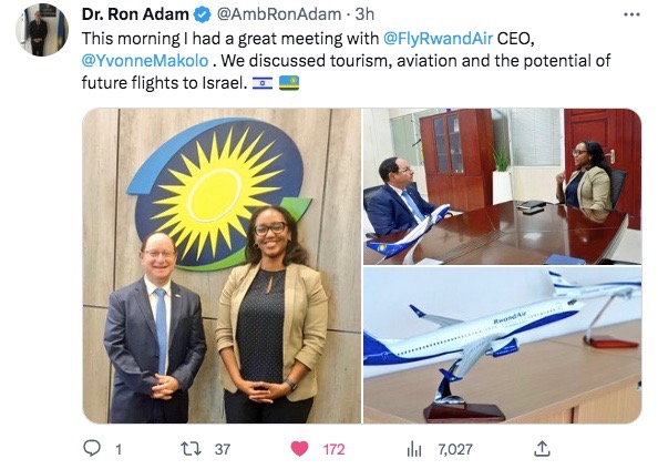 Mu butumwa Dr. Ron Adam yanyujije kuri Twitter yavuze ko muri iki gitondo yagiranye inama ikomeye na CEO wa RwandAir ari we Madamu Yvonne Makolo. Arakomeza ati "Twaganiriye ku bukerarugendo, ubwikorezi bwo mu kirere n’uko mu bihe biza hatangira ingendo zijya muri Israel".