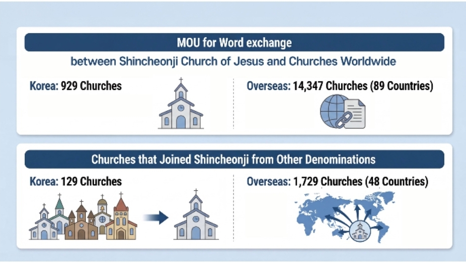 Kuva mu mwaka ushize, amasezerano yo gusangizanya Ijambo yageze ku matorero 969 yo muri Koreya y’Epfo n’amatorero 14.347 mu bihugu 89 byo mu mahanga. Binyuze mu guhindura ibyapa MOAs, amatorero 129 yo muri Koreya yepfo n’amatorero 1.729 yo mu bihugu 48 yahinduye ibyapa byayo ayita Shincheonji Itorero rya Yesu.