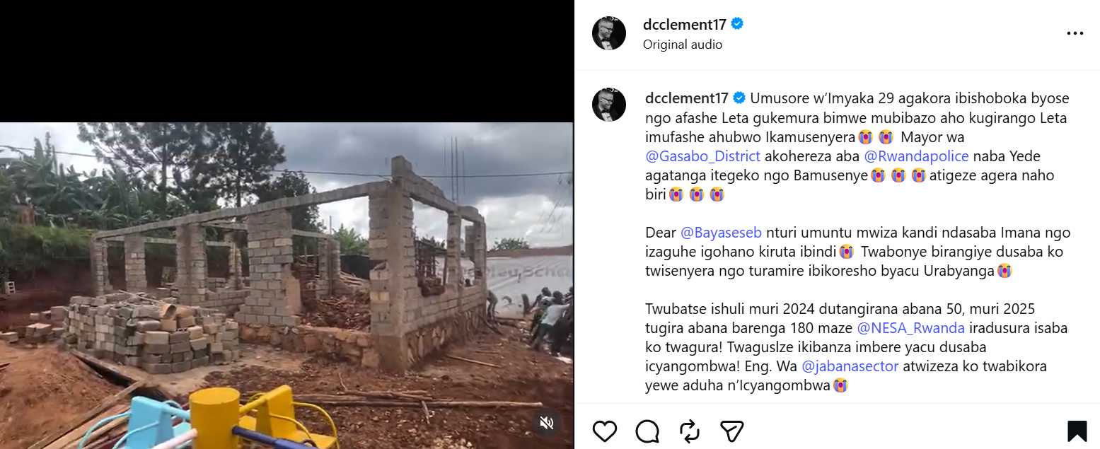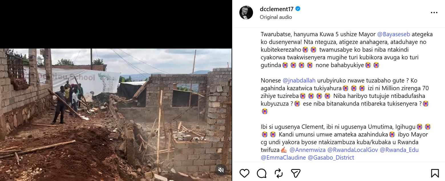Ubutumwa bwa DC Clement kuri Instagram buherekejwe n’amashusho y’inzu zisenywa na Leta