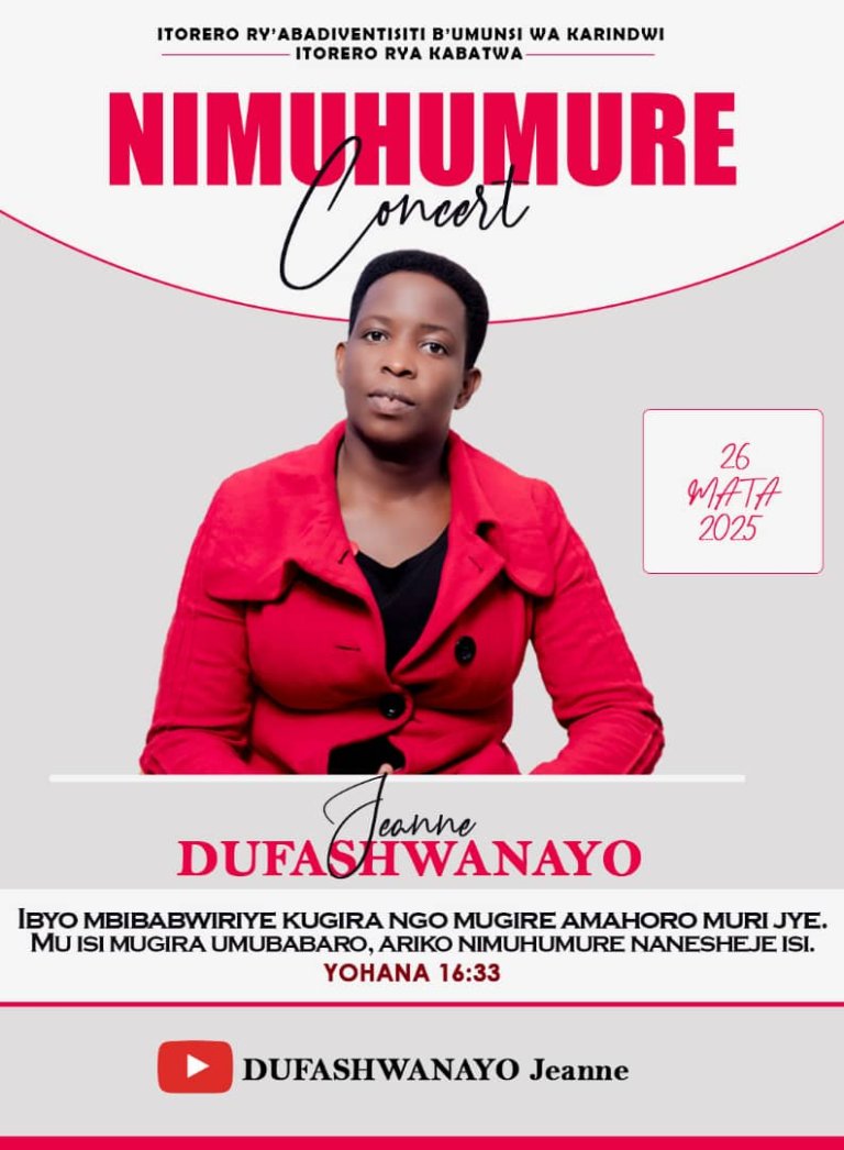 Uyu muhanzikazi Dufashwanayo Jeanne, yakoze igitaramo cyihariye yise “Nimuhumure” ku wa 26 Mata 2025, cyabereye mu Karere ka Nyabihu, mu Itorero ry’Abadiventisiti b’Umunsi wa Karindwi (SDA) rya Kabatwa, mu Ntara y’Ivugabutumwa ya Kalisimbi.