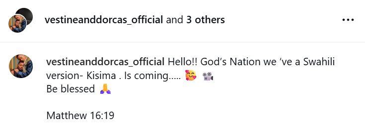Mu butumwa bageneye abakunzi babo ku mbuga nkoranyambaga, Vestine, Dorcas na Murindahabi Irene bagize bati: “Muraho neza bwoko bw’Imana? Dufite indirimbo ihinduwe mu Giswayile, Kisima. Iri hafi kujya hanze. Muhabwe umugisha.” “Hello! God’s Nation, we’ve a Swahili version – Kisima is coming… Be blessed.” (Matthew 16:19)