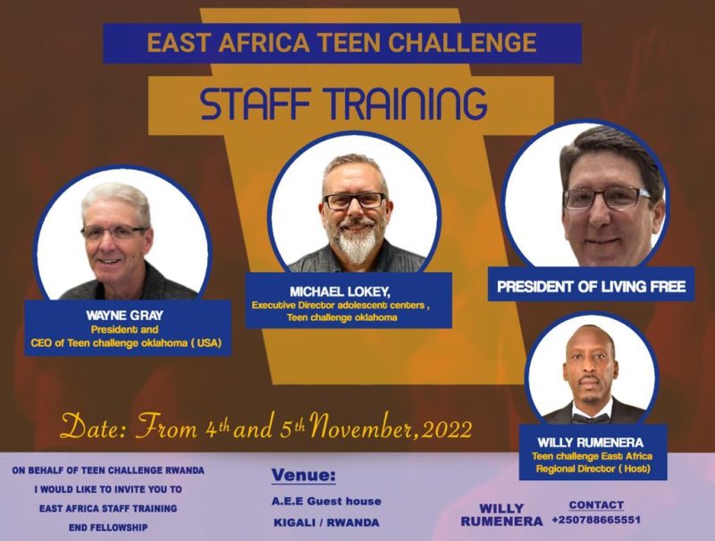 Rwanda is soon to host "East Africa Teen Challenge Staff Training" that will take place on November 4th-5th, 2022 in Kigali at A.E.E Guest House. Greg W. Keylon, Global President of Living Free, will attend this training.