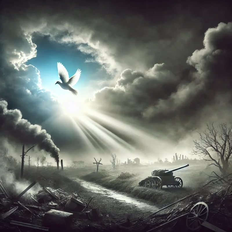 This is an image depicting war to a small extent, showing a devastated place with light at the horizon, symbolizing hope. There is a dove in the sky, representing peace and reconciliation.